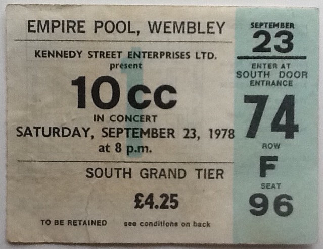 10cc Original Used Concert Ticket Empire Pool Wembley London 23rd Sep 1978
