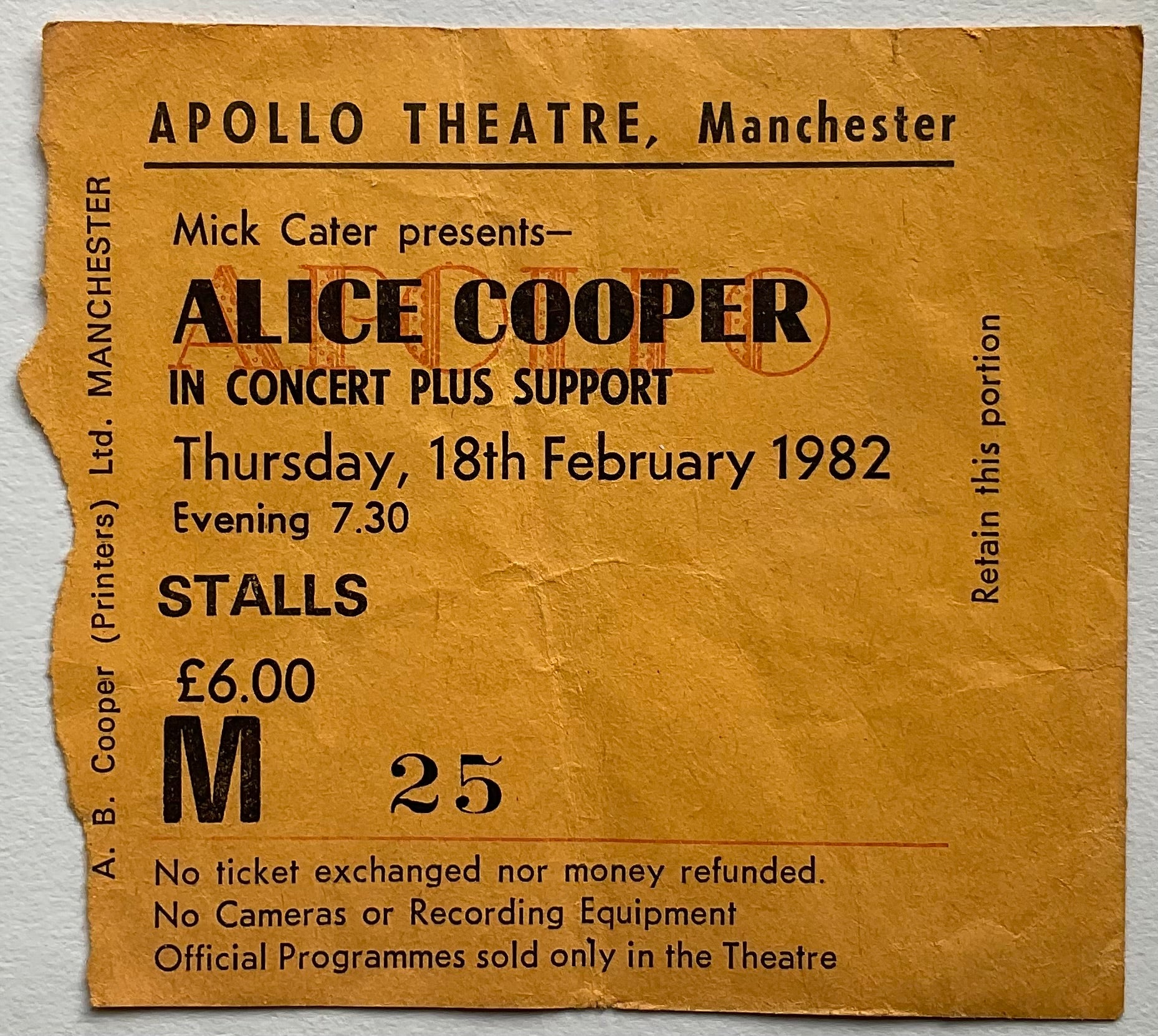 Alice Cooper Original Used Concert Ticket Apollo Theatre Manchester 18th Feb 1982