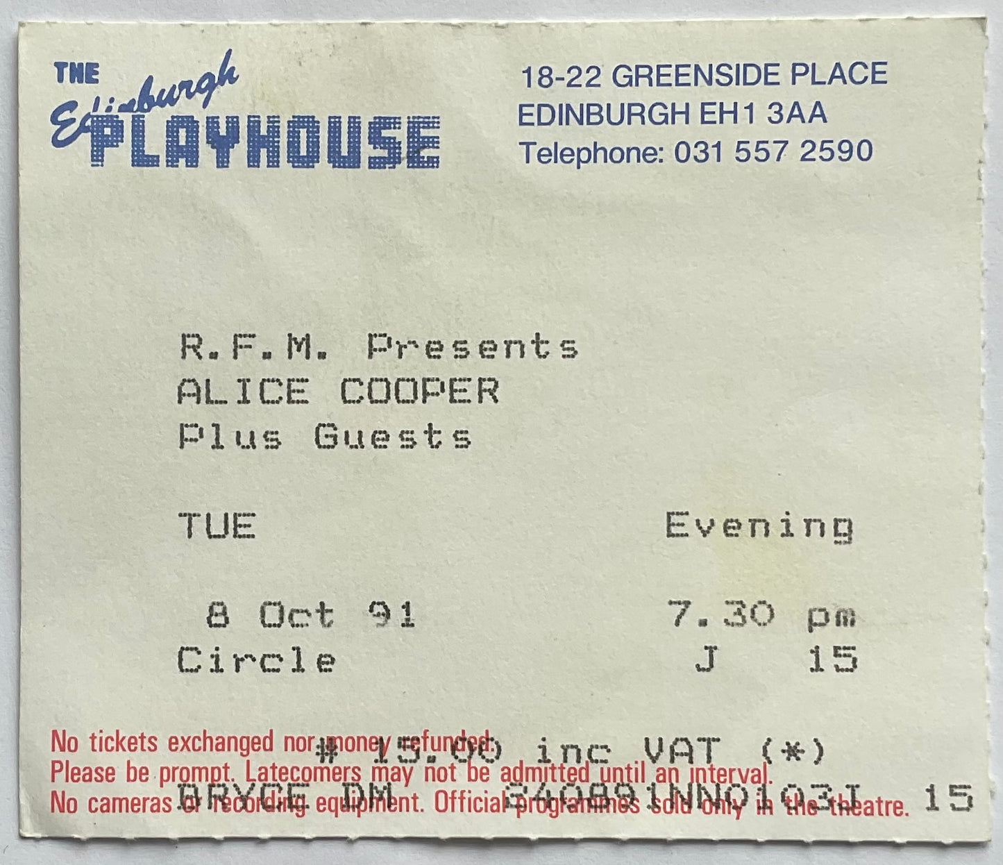 Alice Cooper Original Used Concert Ticket Edinburgh Playhouse 8th Oct 1991