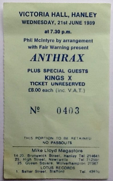 Anthrax Original Used Concert Ticket Victoria Hall Hanley 1989