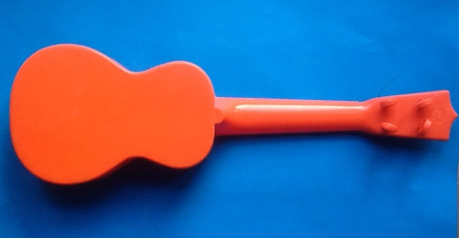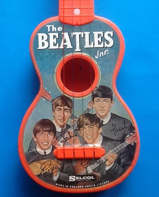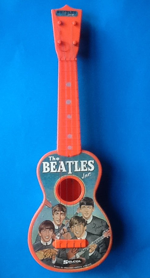 The Beatles Jnr Guitar manufactured by Selcol Products Ltd and measures 14 1/4" in length. Extremely rare guitar that has a colour paper photo of the Beatles and facsimile signatures pasted onto the front of it. Also has 'Made in England Under Licence' printed along the bottom of the photo. Guitar has its original strings and pegs and still has the original 'Beatles Jnr' sticker on the top of the headstock.