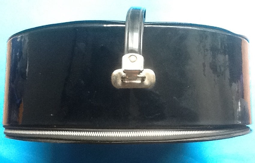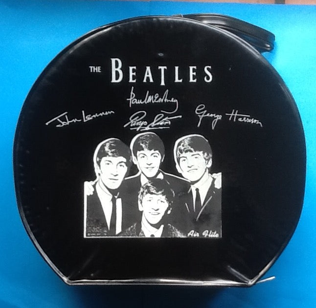 An original Beatles black coloured Vinyl circular overnight Case/ Bag manufactured by Air Flite, U.S.A. The case stands 12 1/2" tall including the top handle clasp. Zipper runs around the front edge of the case. The front of the case has an image of the Beatles together with their facsimile signatures above their image. These were available in either a black or red colour back in the day.