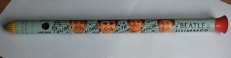 An Original Hummer toy instrument manufactured by Louis F. Dow Co in 1964. Cardboard tube measures 11” in length and 3/4” diameter with images of the Beatles on a blue background, with plastic ends. This is the rarer Red ended version. In excellent condition. Please refer to the photos.