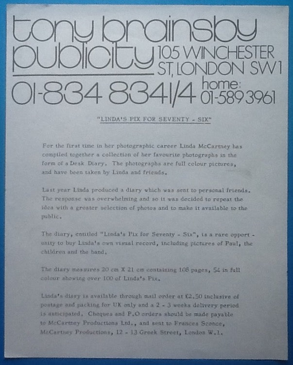 A one page Press Publicity release issued by Tony Brainsby Publicity in 1975 announcing the 'Linda's Pix For Seventy - Six' Desk Diary. A collection of her favourite photographs compiled in the form of a desk diary.