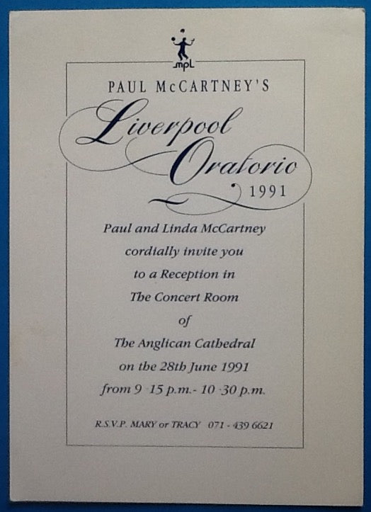 Additional info : An invitation from Paul & Linda McCartney to the Reception after the performance to celebrate the 150th anniversary of the Royal Liverpool Philharmonic Society with the Wotld Premiere performance of Paul McCartney's Liverpool Oratorio, conducted by Carl Davis. One sided invitation measures 8 1/4" x 5 7/8"