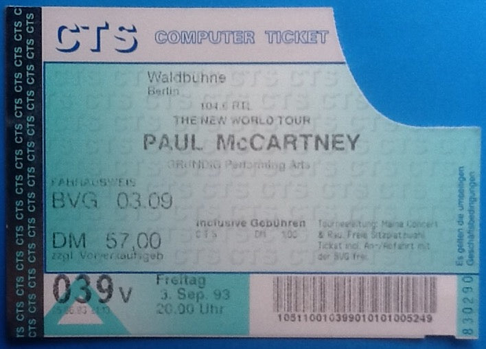 Beatles Paul McCartney Used Concert Ticket Berlin 1993