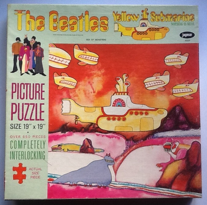 A large still sealed and unused Yellow Submarine 'Sea of Monsters' Picture Jigsaw Puzzle manufactured by Jaymar Specialty Company, New York. Completely interlocking over 650 pieces makes a jigsaw measuring 19" x 19" when completed. All housed in a picture box that measures 12 1/4" x 12 1/4" x 1 1/2". This is one of a selection of 6 different titles made in this size in this series of jigsaw puzzles.