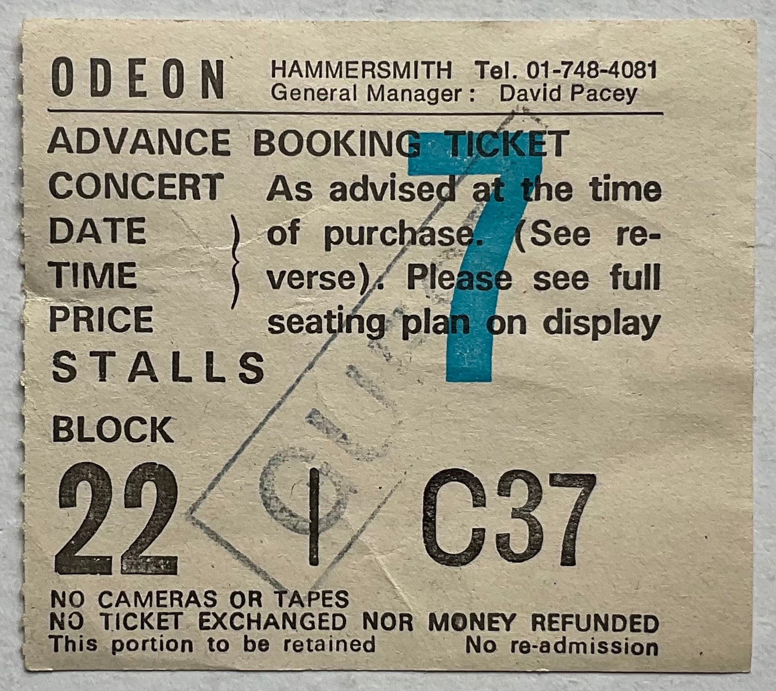Additional Info : Original Stalls Ticket Block 22 Row C Seat 37