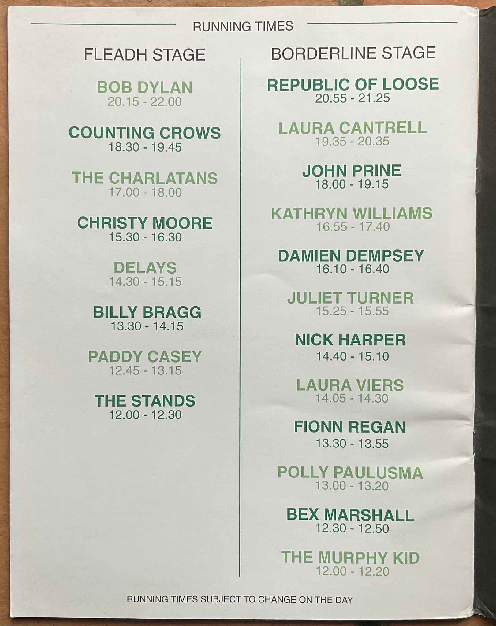 Artists : Bob Dylan, Counting Crows, The Charlatans, Christy Moore, Delays, Billy Bragg and others