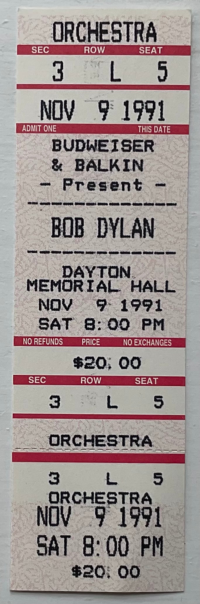 Bob Dylan Original Unused Concert Ticket Dayton Memorial Hall 9th Nov 1991