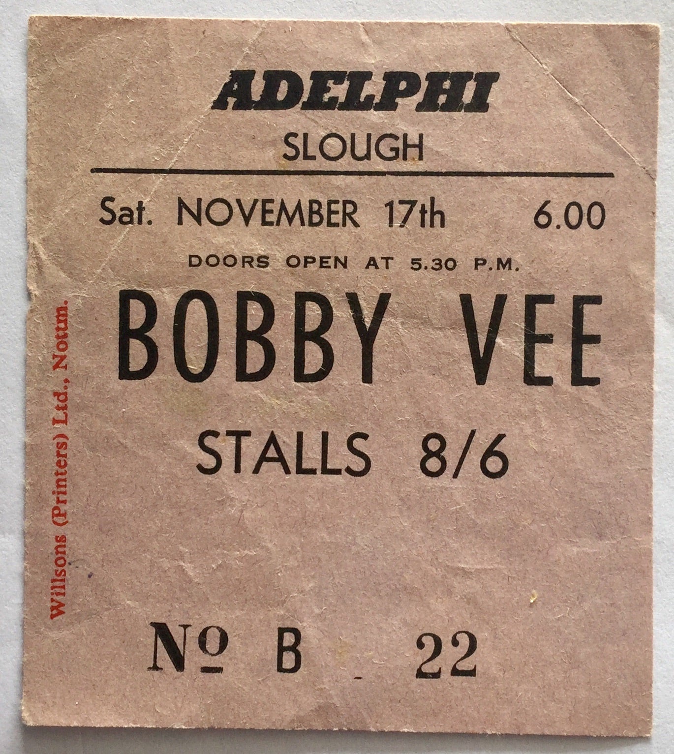 Bobby Vee Crickets Original Used Concert Ticket Adelphi Theatre Slough 17th Nov 1962