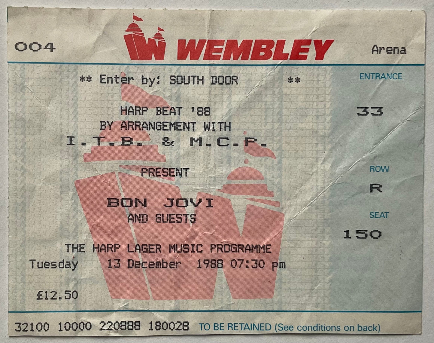 Bon Jovi Original Used Concert Ticket Wembley Arena London 13th Dec 1988