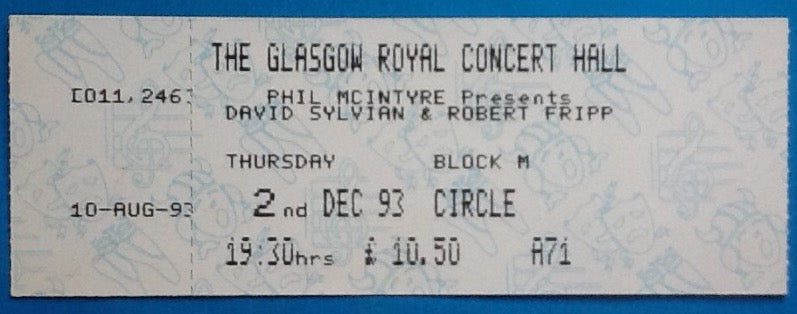 David Sylvian Robert Fripp Original Unused Concert Ticket Glasgow 1993