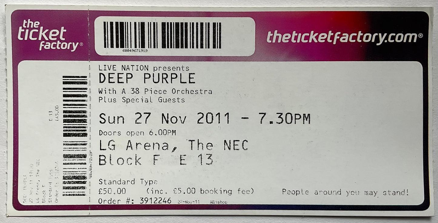 Deep Purple Original Unused Concert Ticket NEC Arena Birmingham 27th Nov 2011