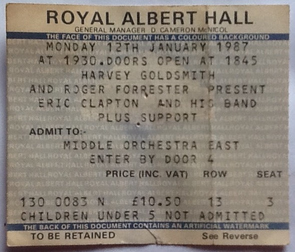 Eric Clapton Original Used Concert Ticket Royal Albert Hall London 12th Jan 1987
