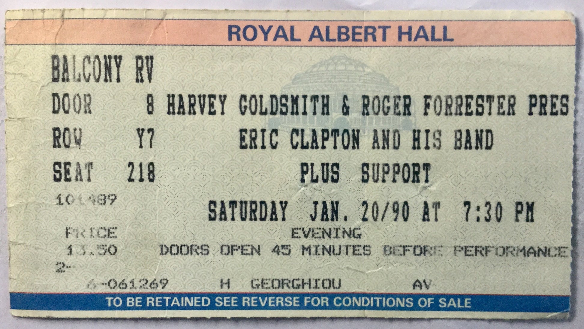 Eric Clapton Original Used Concert Ticket Royal Albert Hall London 20th Jan 1990