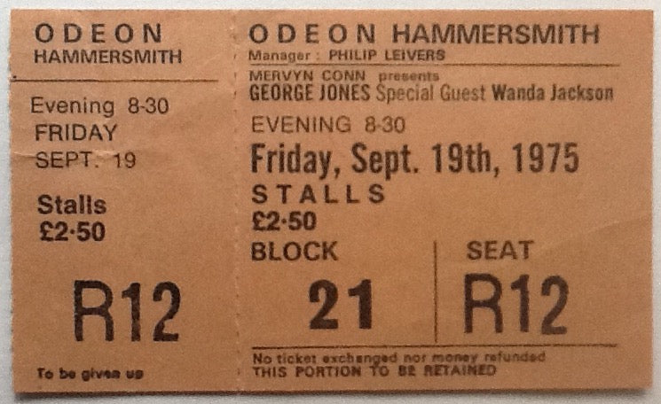 George Jones Original Unused Concert Ticket Hammersmith Odeon London 1975