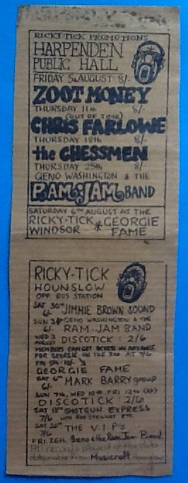 Additional Info : These rather basic handwritten handbill flyers were produced to help promote performances at the various Ricky Tick Clubs scattered around the South West of London. This Handbill has not been completely cut down leaving two handbills still attached! This black/ brown handbill measures 6 1/2" x 2 3/8"