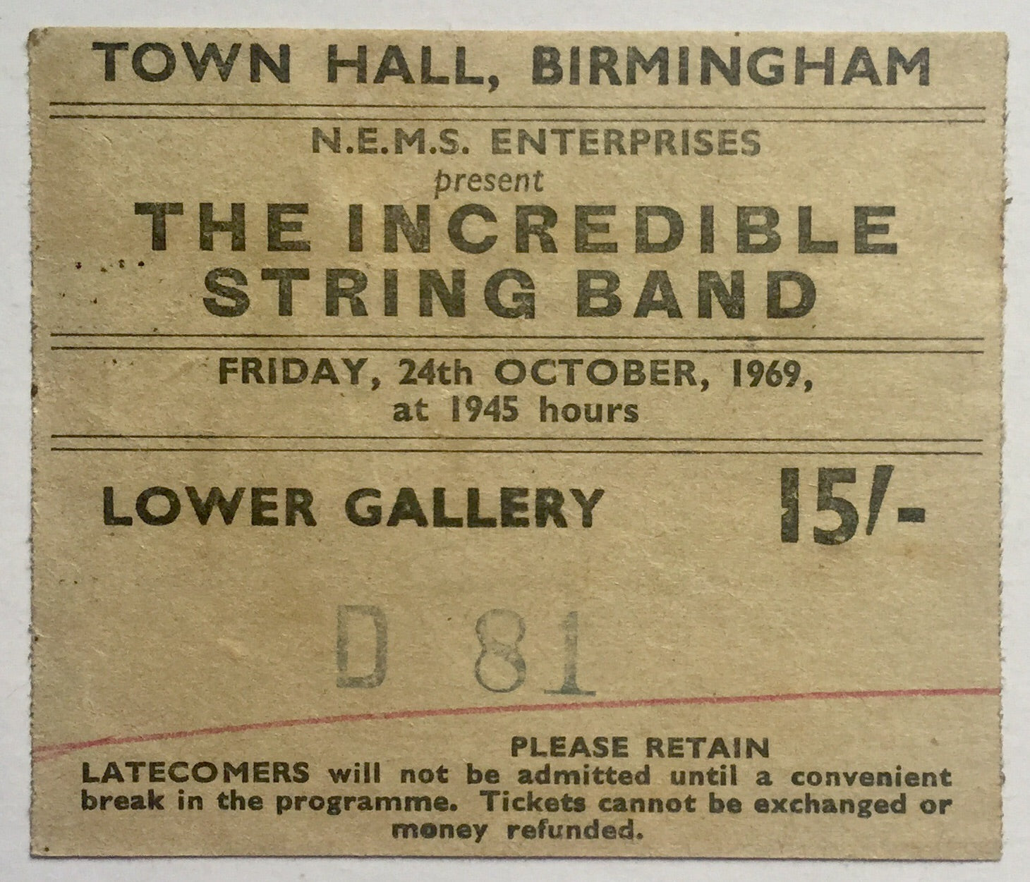 Incredible String Band Original Used Concert Ticket Town Hall Birmingham 1969
