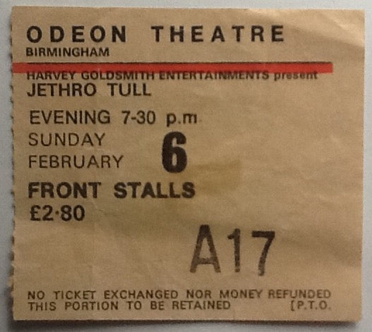 Jethro Tull Original Used Concert Ticket Odeon Theatre Birmingham 1977