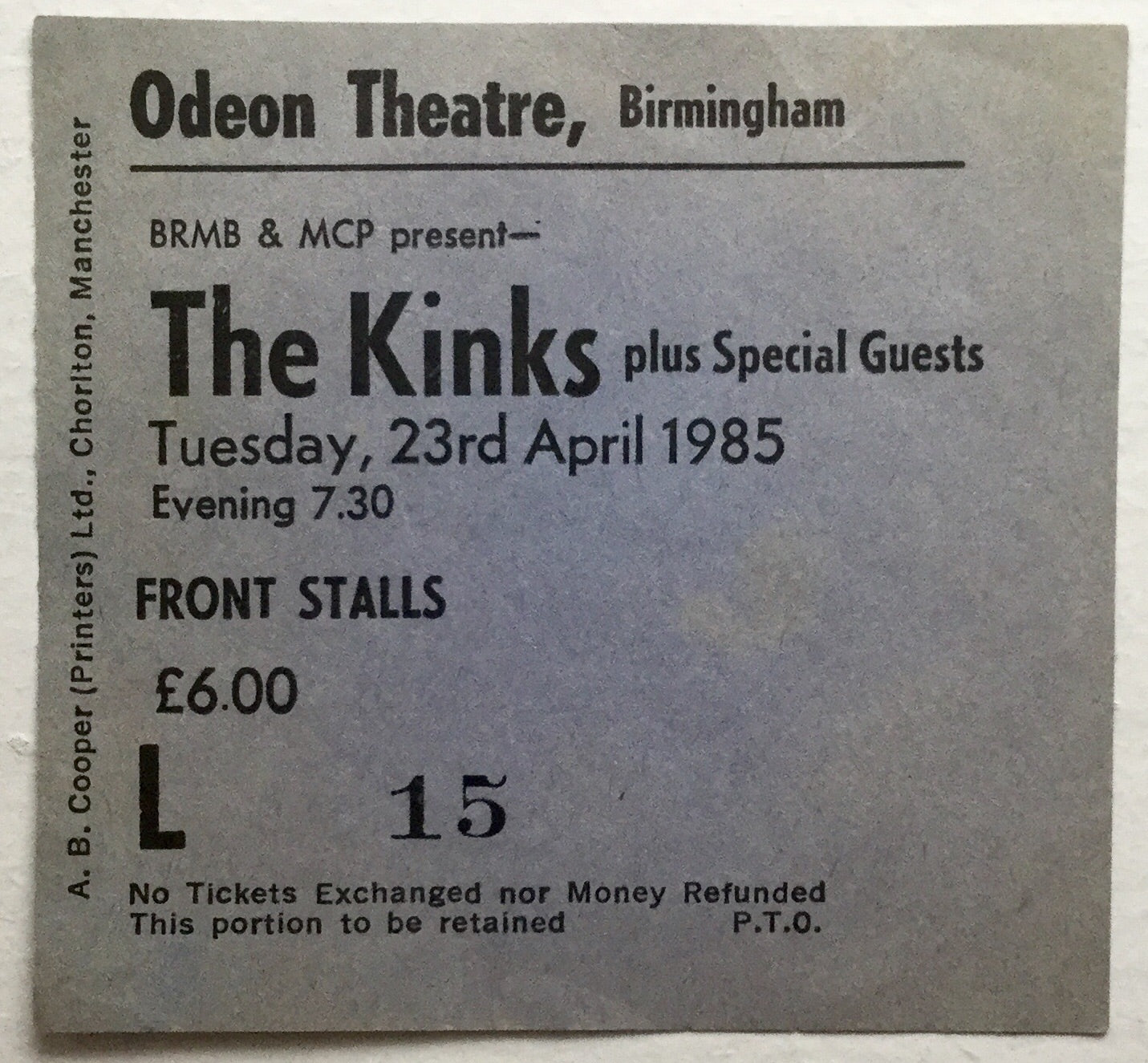 Kinks Original Used Concert Ticket Odeon Theatre Birmingham 23rd Apr 1985