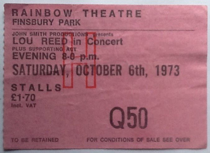Lou Reed Original Used Concert Ticket Rainbow Theatre London 1973