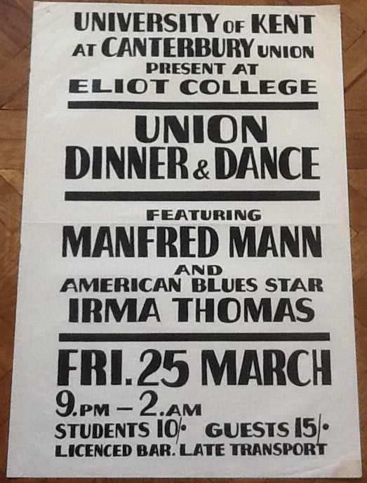 Manfred Mann Irma Thomas Original Concert Tour Gig Poster University of Kent 1966