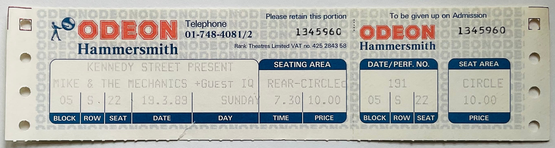Mike & the Mechanics Original Unused Concert Ticket Hammersmith Odeon London 19th Mar 1989