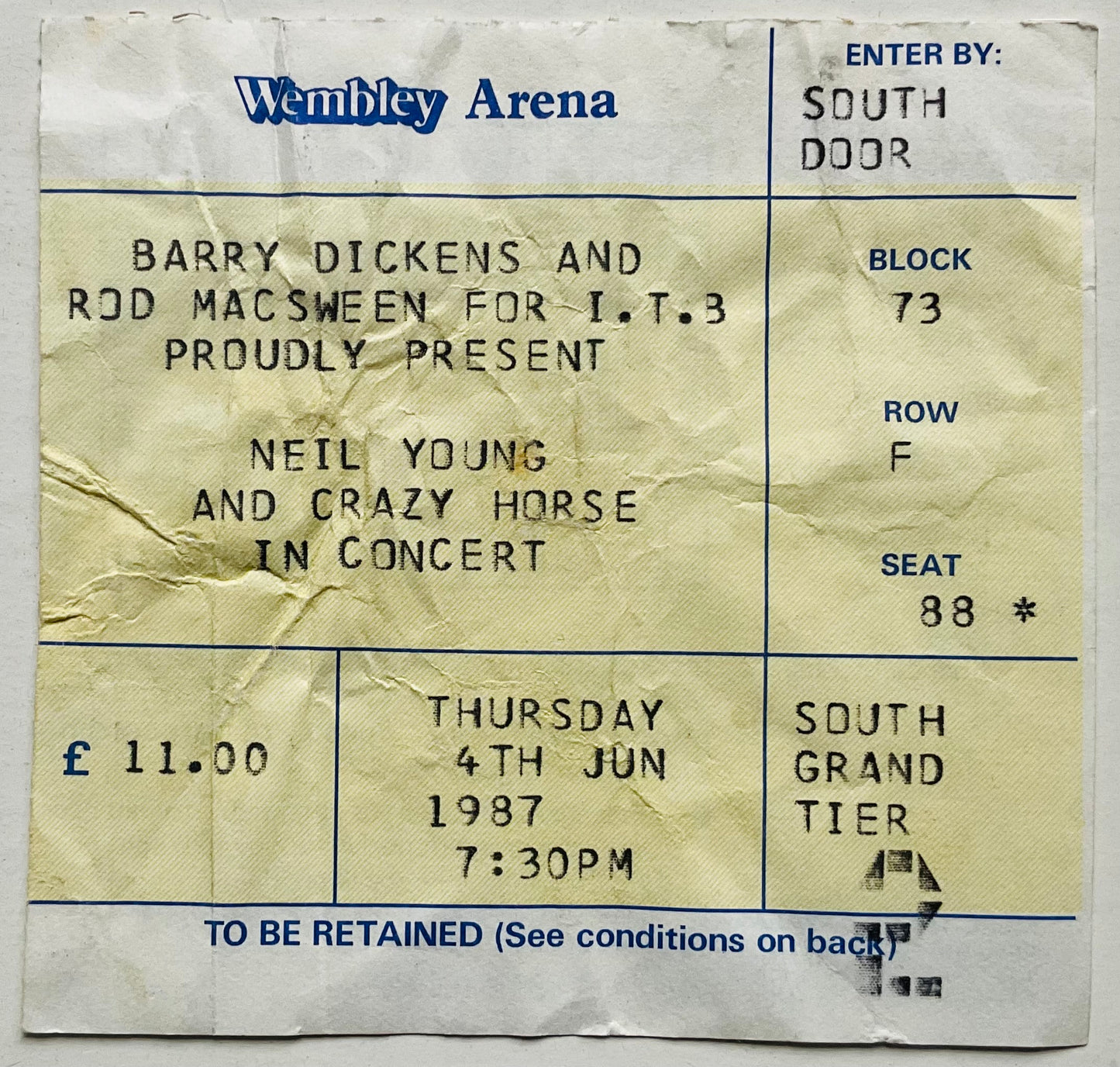 Neil Young Original Used Concert Ticket Wembley Arena London 4th Jun 1987
