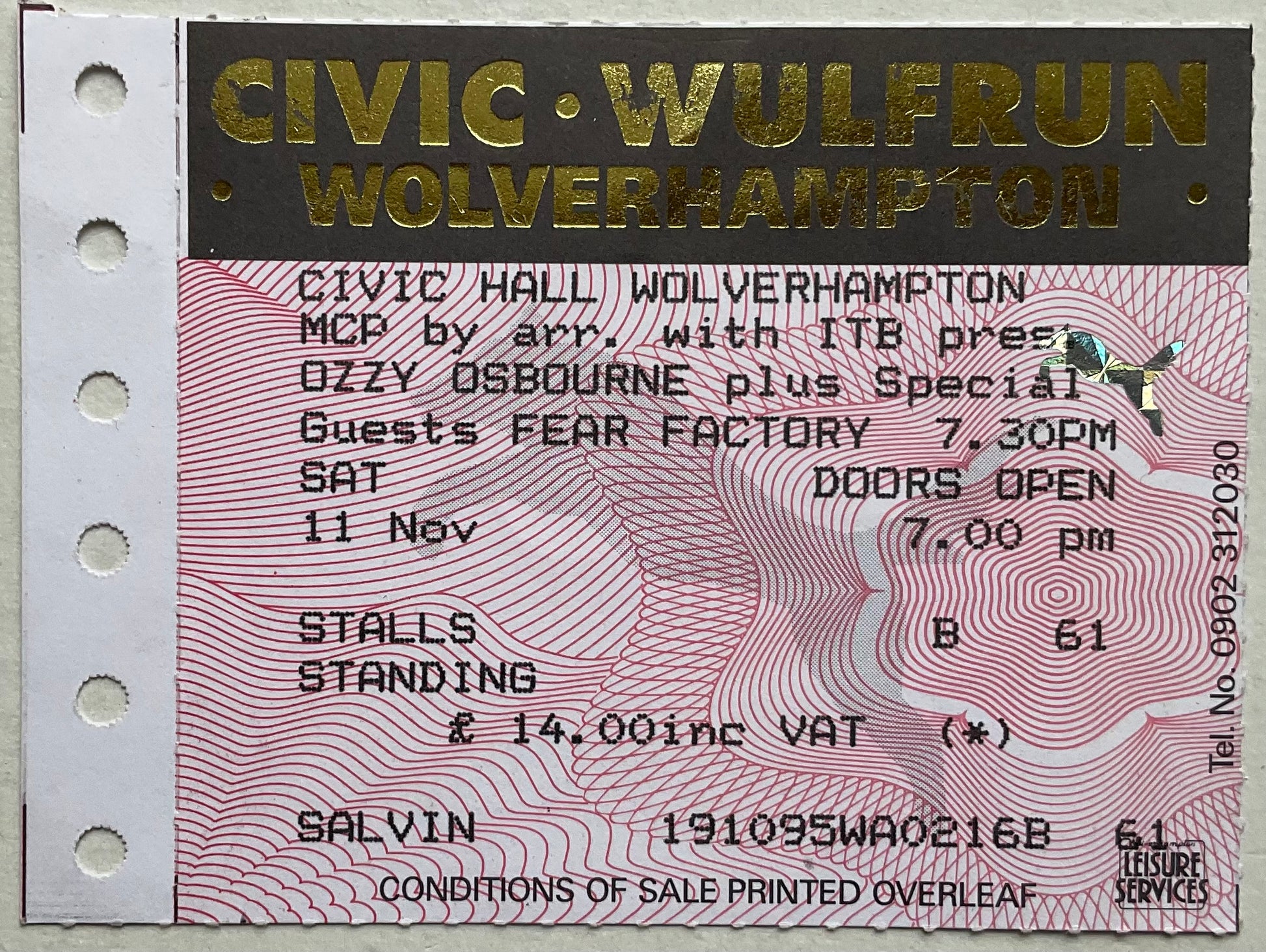 Ozzy Osbourne Original Used Concert Ticket Civic Hall Wolverhampton 11th Nov 1995