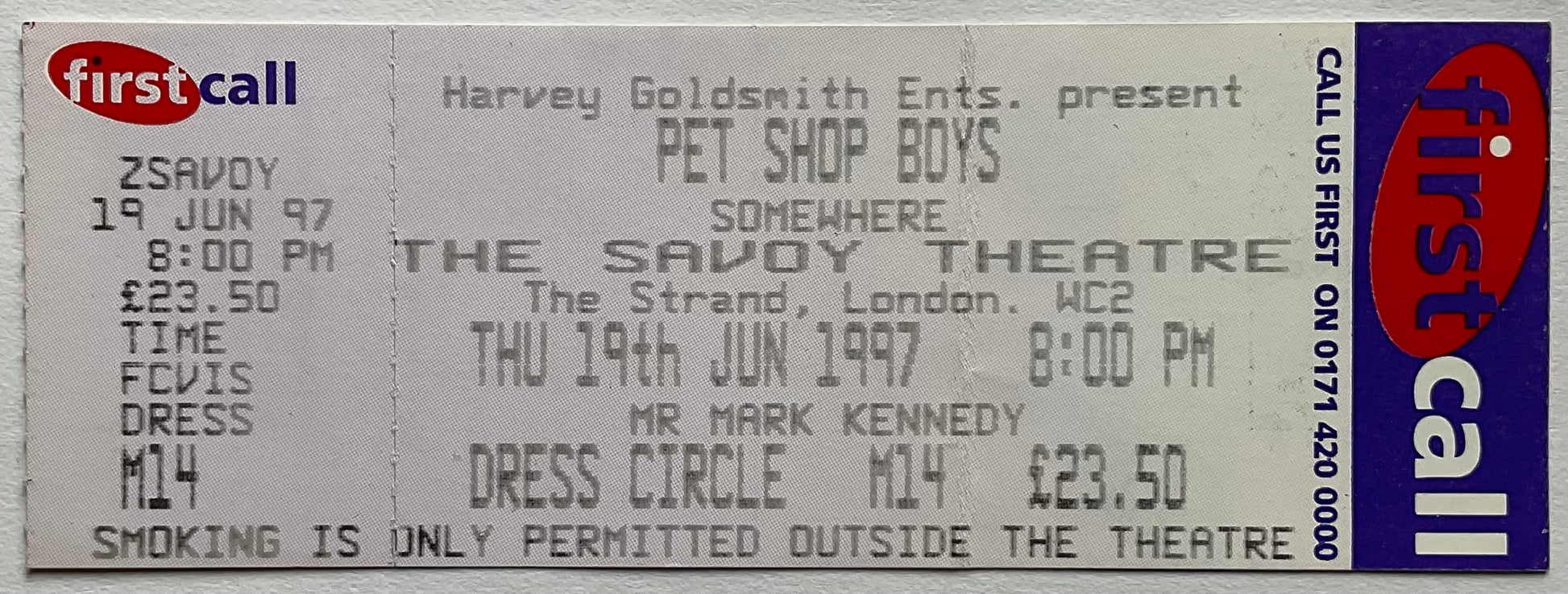Pet Shop Boys Original Unused Concert Ticket Savoy Theatre London 19th Jun 1997