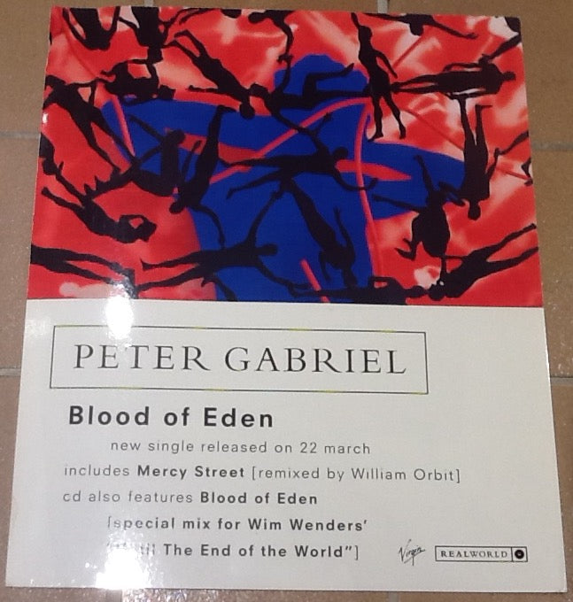 A large promotional coloured cardboard in-store stand up easel backed shop display used to promote the new single 'Blood of Eden' released on 22nd March 1992. New single release includes 'Mercy Street (remixed by William Orbit) and the cd also features 'Blood of Eden (Special mix for Wim Wenders 'Until the End of the World')'. Released on the Virgin Real World label. Cardboard display measures 24" x 20" and is in overall Very Good condition.