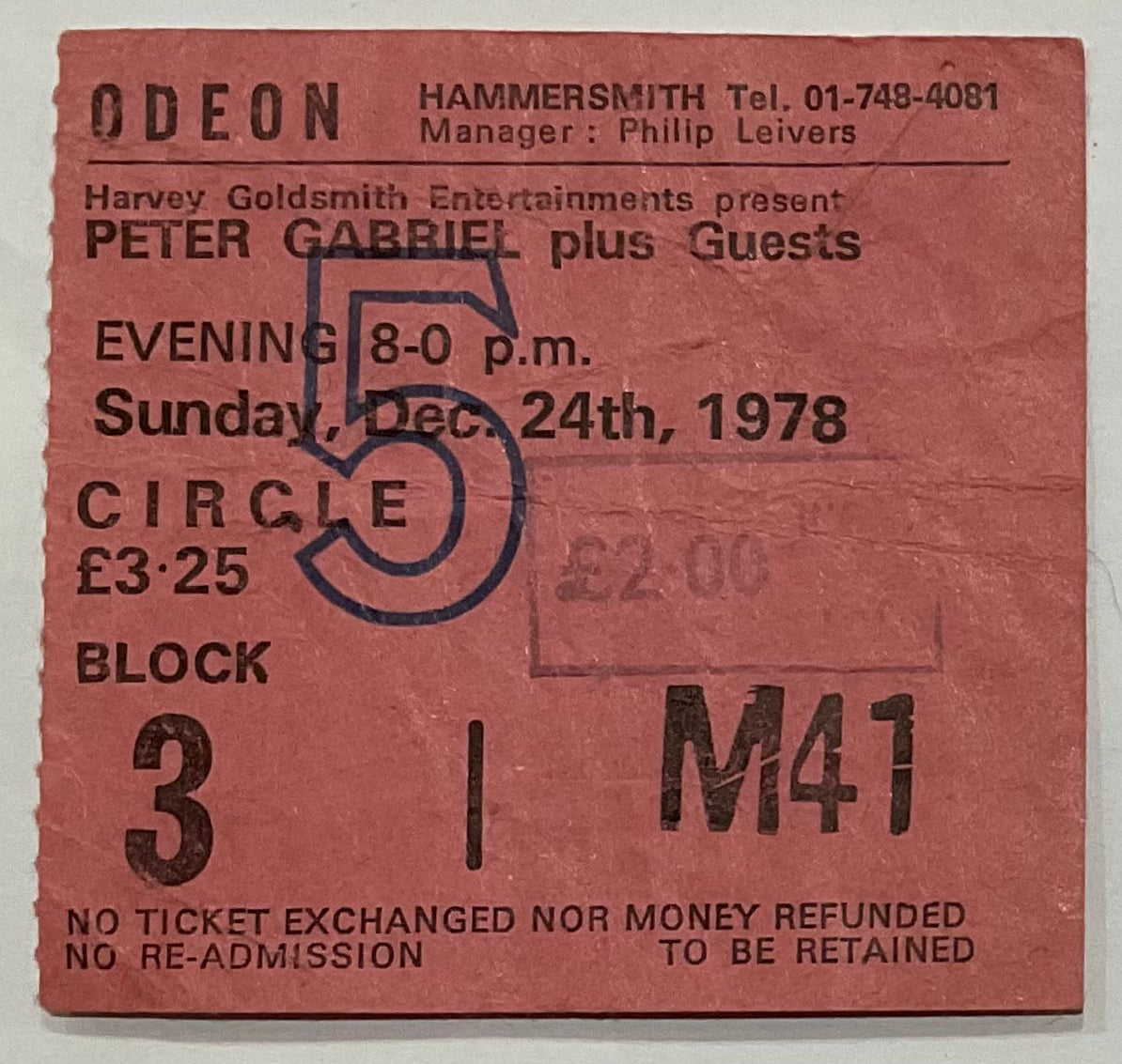 Peter Gabriel Original Used Concert Ticket Hammersmith Odeon London 24th Dec 1978