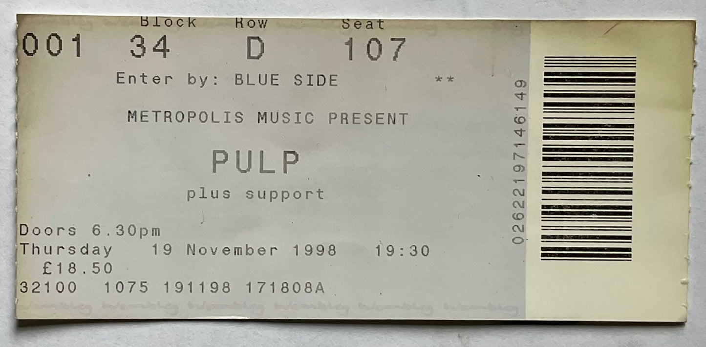 Pulp Original Used Concert Ticket Wembley Arena London 19th Nov 1998