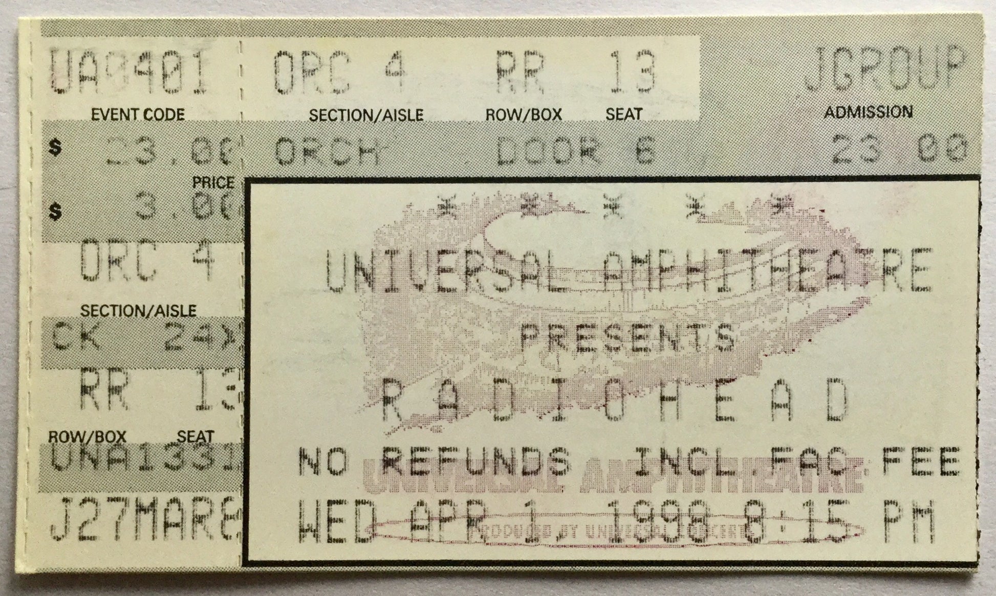 Radiohead Original Used Concert Ticket Universal Amphitheatre Los Angeles 1st Apr 1998