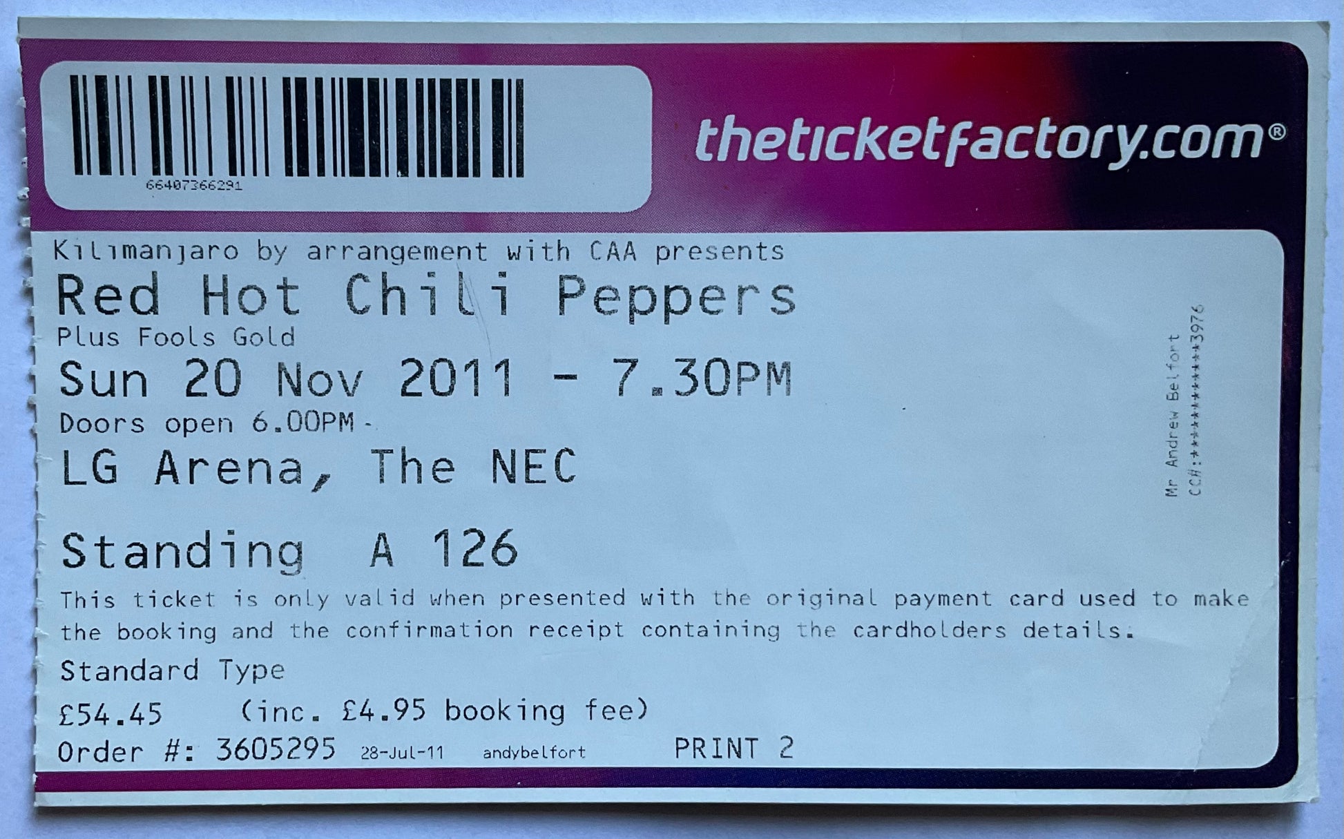 Red Hot Chili Peppers Original Used Concert Ticket NEC Birmingham 20th Nov 2011