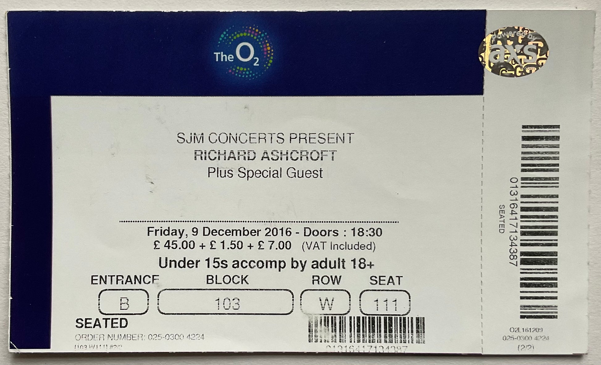Richard Ashcroft Original Unused Concert Ticket O2 Arena London 9th Dec 2016