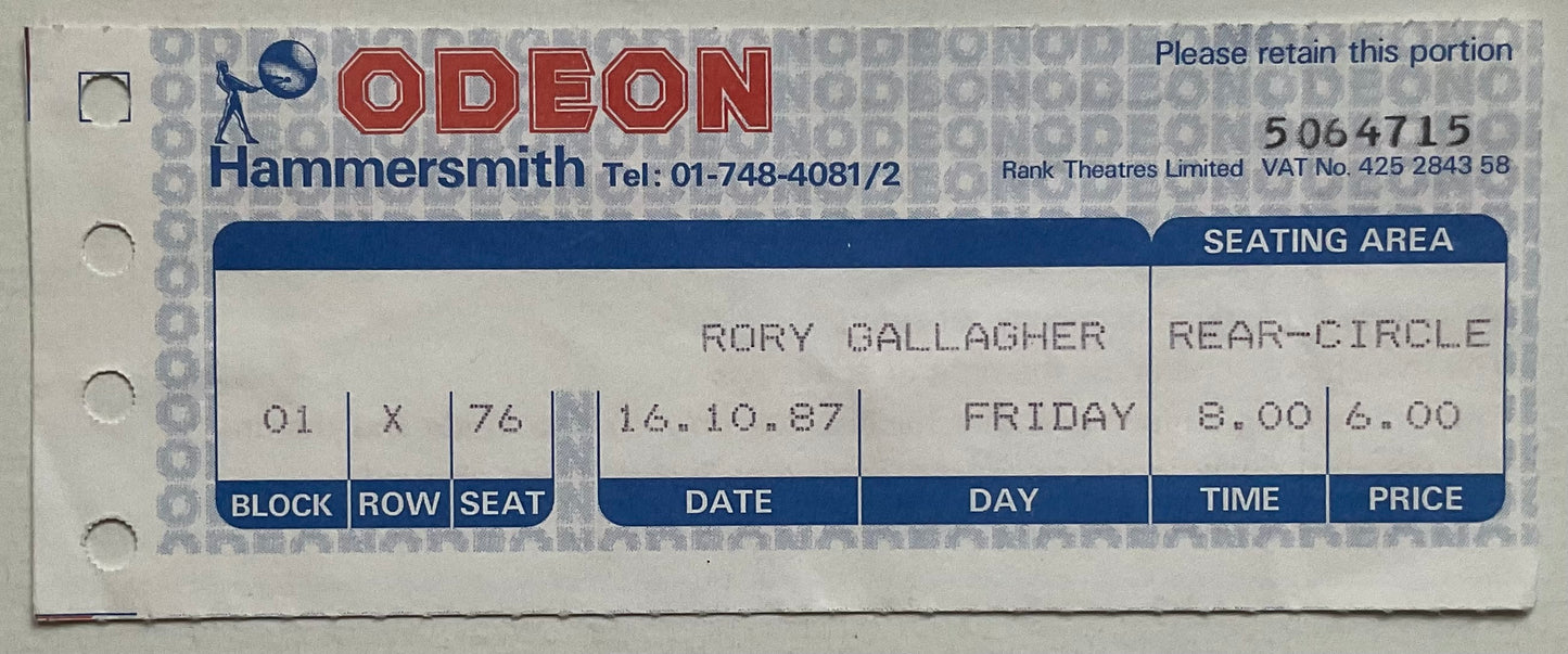 Rory Gallagher Original Concert Ticket Hammersmith Odeon London 16th Oct 1977