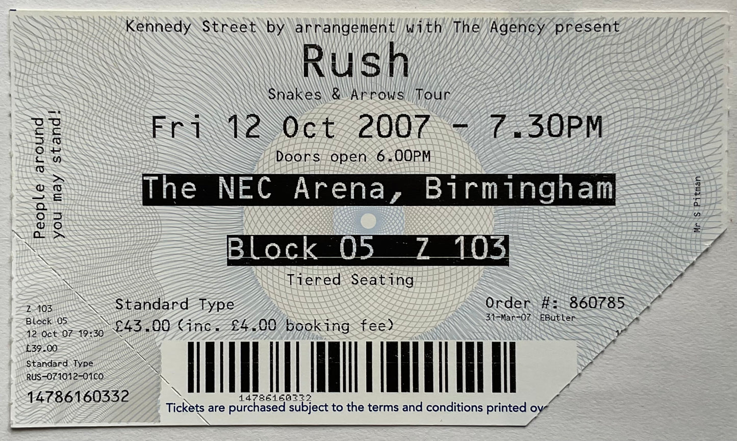 Rush Original Used Concert Ticket NEC Arena Birmingham 12th Oct 2007