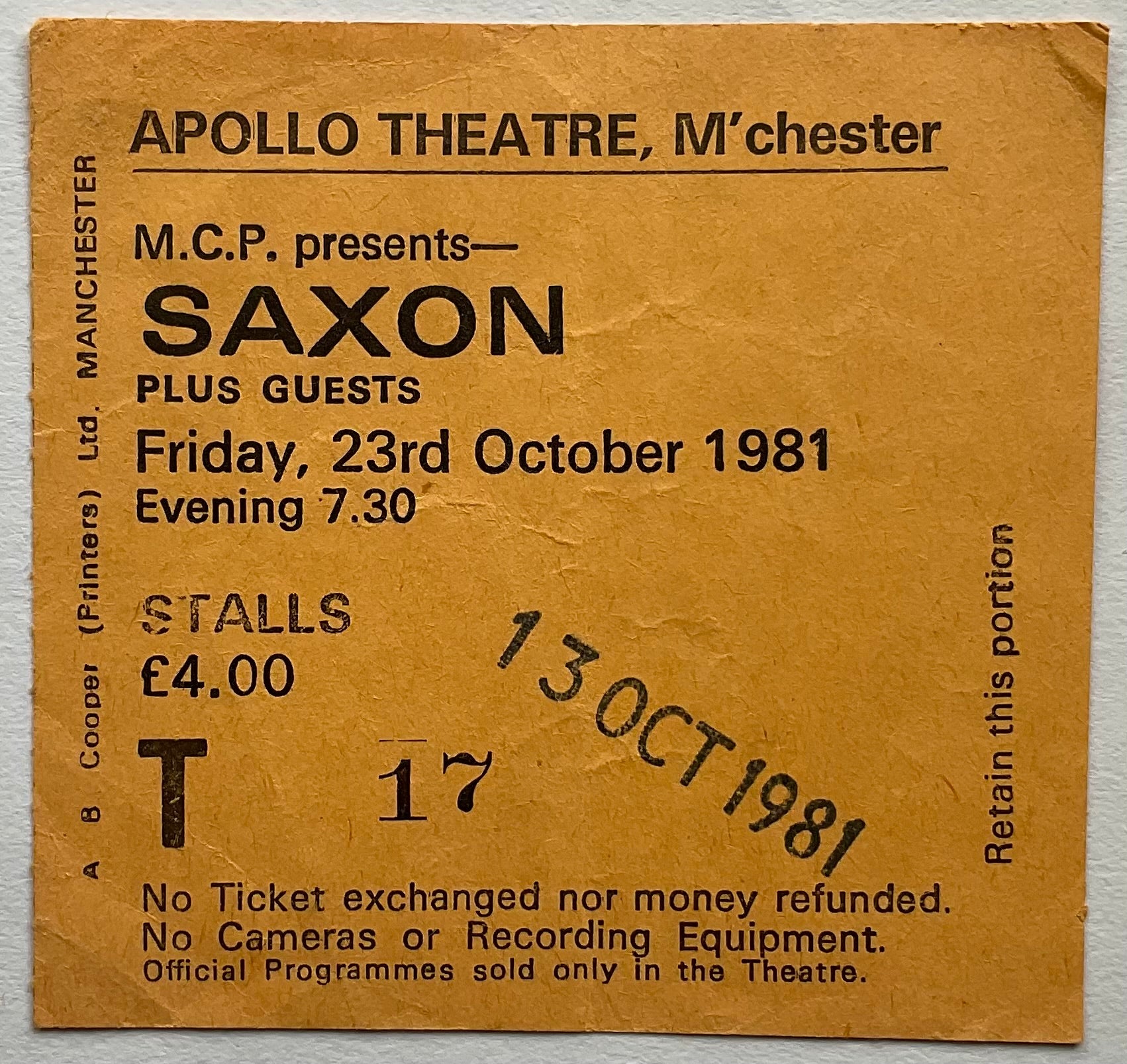 Saxon Original Used Concert Ticket Apollo Theatre Manchester 13th Oct 1981