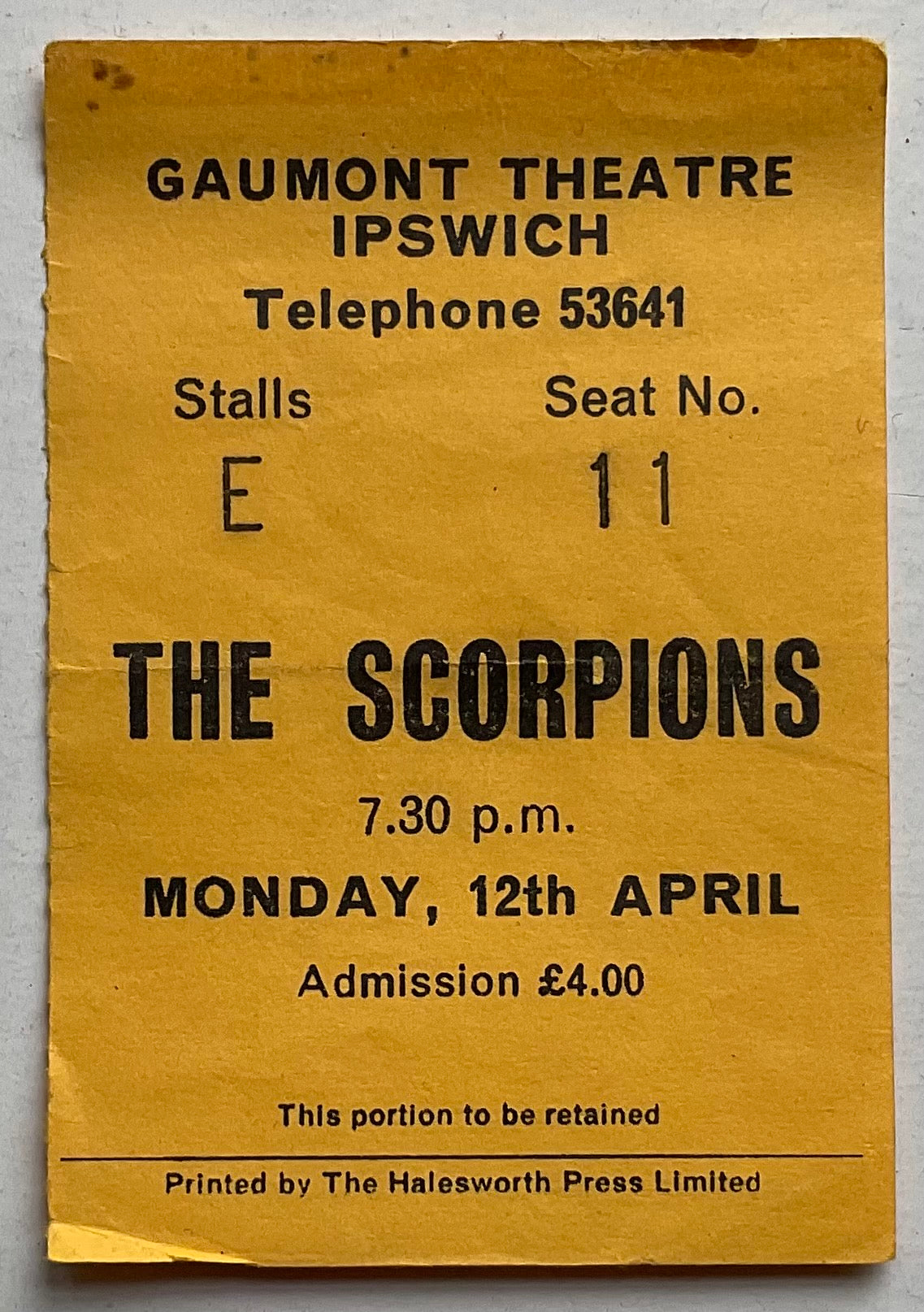 Scorpions Original Used Concert Ticket Gaumont Theatre Ipswich 12th Apr 1982