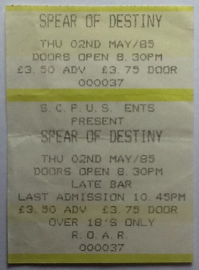 Spear of Destiny Original Used Concert Ticket S.C.P.U.S. Sheffield 1985