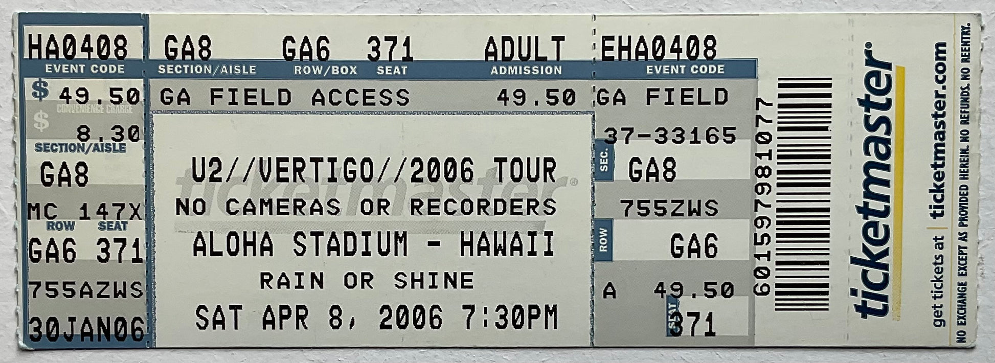 U2 Original Unused Concert Ticket Aloha Stadium Hawaii 8th Apr 2006
