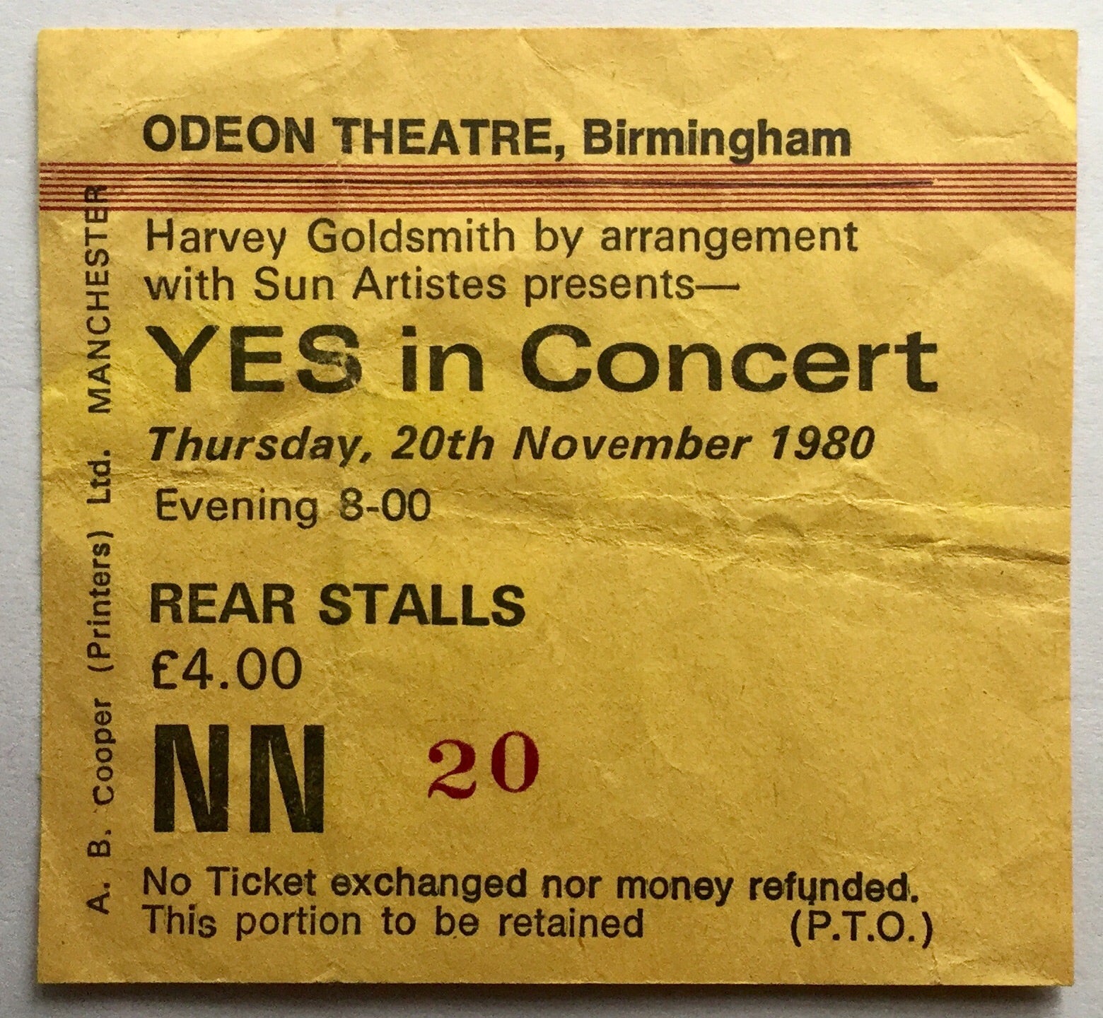 Yes Original Used Concert Ticket Odeon Theatre Birmingham 20th Nov 1980